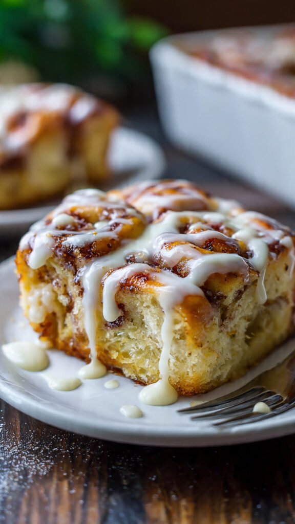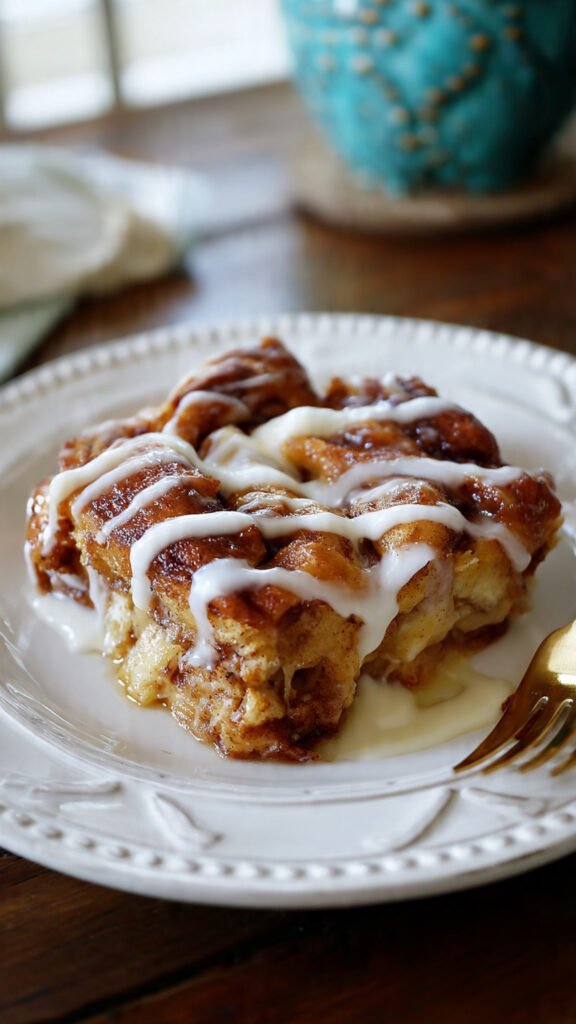 Serve the breakfast bake warm, scooping portions onto individual plates. The combination of tender cinnamon rolls, sweet apples, and creamy icing creates an unforgettable breakfast experience.