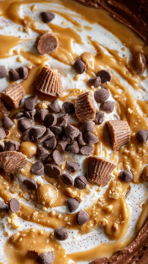 What makes this dessert truly special is the contrast of textures and flavors. You get the soft, moist chocolate cake base, punctuated by pockets of tangy cream cheese and nutty peanut butter, all studded with melty chocolate chips and mini Reese’s cups. Every bite delivers that perfect balance of sweet and slightly salty, creamy and cakey, making it impossible to have just one piece.