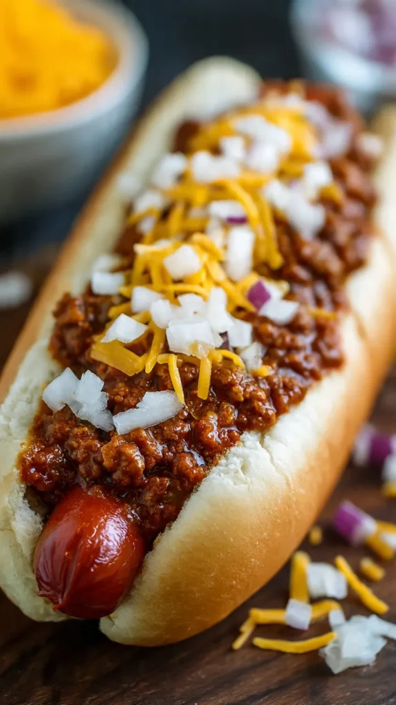 - Classic chili dogs with shredded cheddar cheese and diced white onions