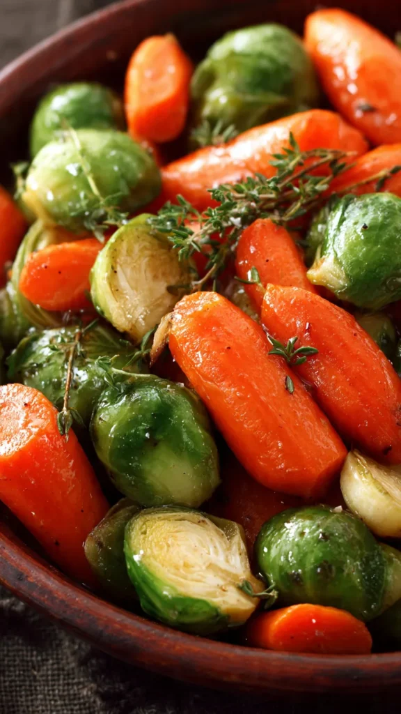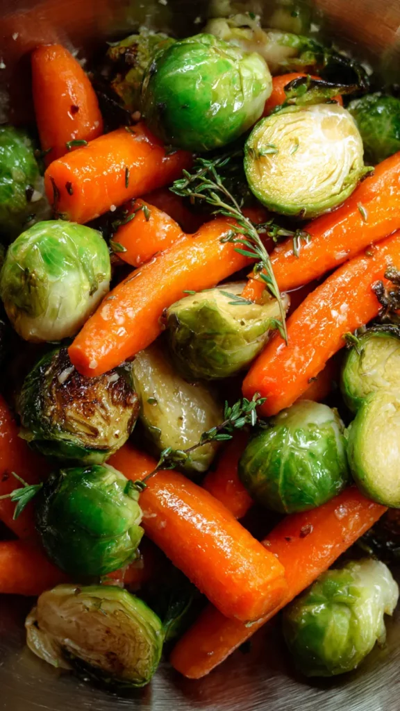 The combination of carrots and Brussels sprouts creates an ideal balance of flavors and textures. Baby carrots bring natural sweetness and a tender bite, while Brussels sprouts offer a slightly nutty, earthy quality that grounds the dish. When paired with the rich maple glaze infused with butter, garlic, and fresh thyme, these vegetables transform into something truly special.