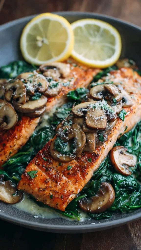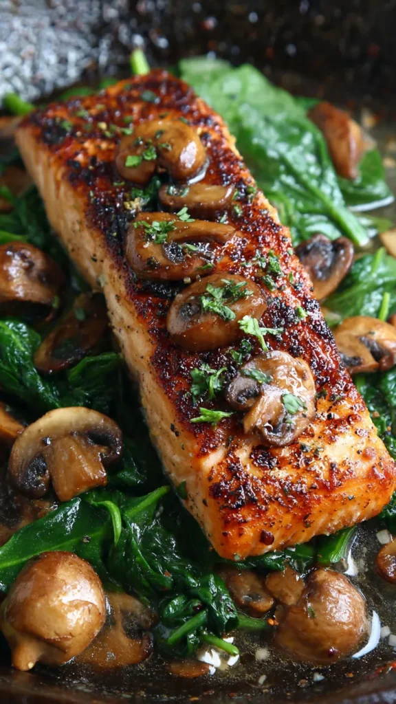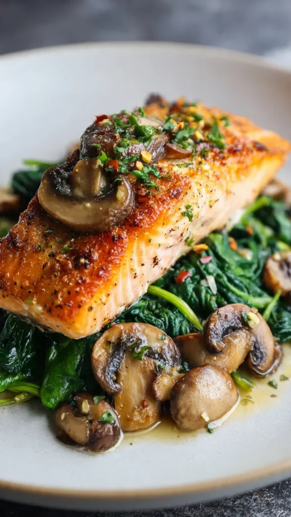 The pairing of salmon with spinach and mushrooms draws from Italian “Florentine” preparations, where spinach features prominently, and French techniques that emphasize mushrooms as a textural and flavor complement to proteins. This particular combination emerged in home cooking and contemporary restaurants as a way to create a complete, nutritionally balanced meal in a single panโappealing to both health-conscious diners and busy home cooks seeking restaurant-quality results without complex techniques.