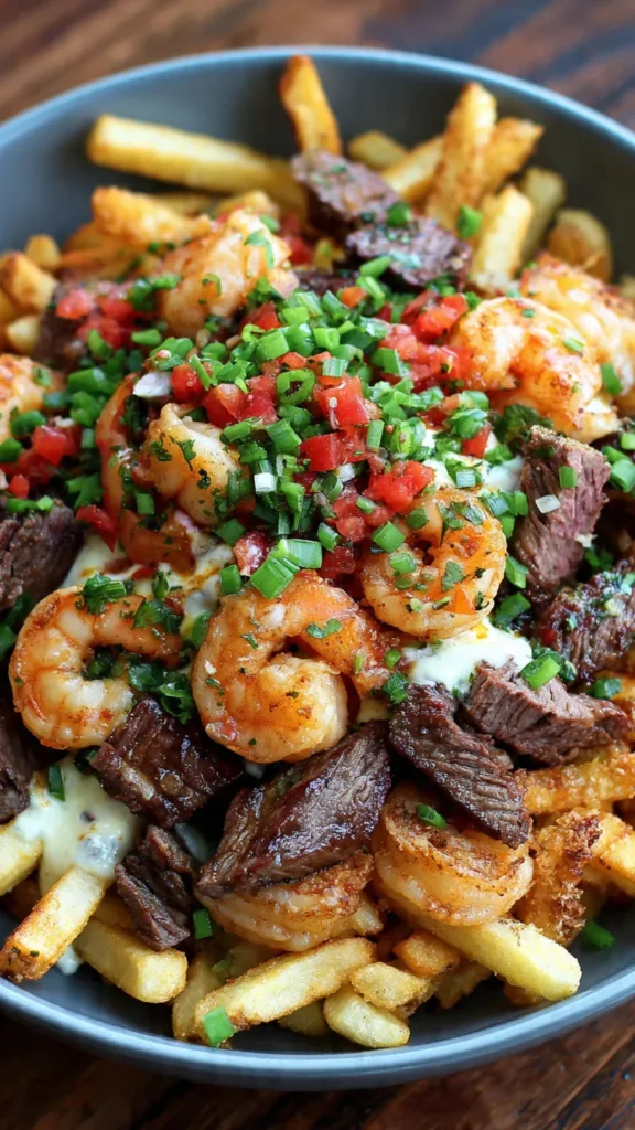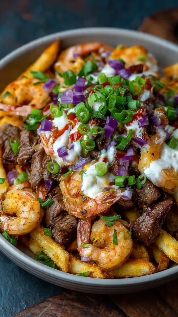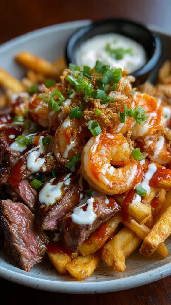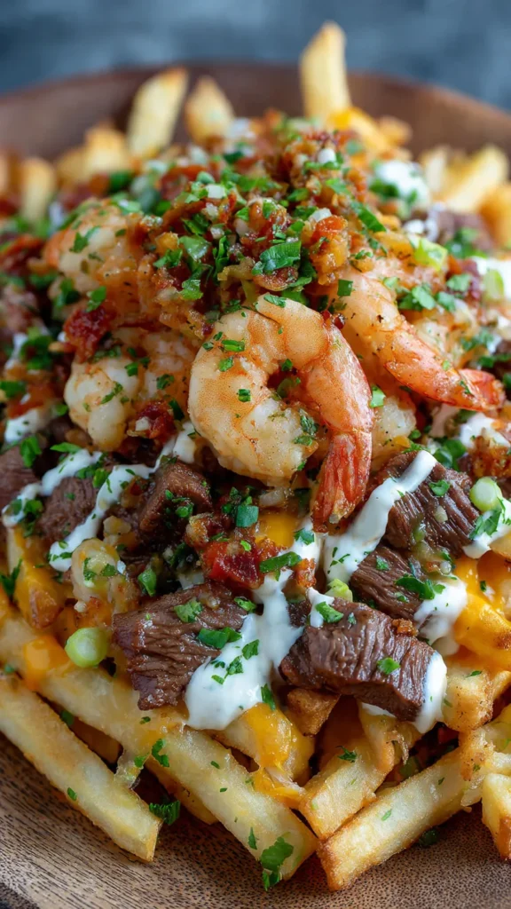 The beauty of loaded fries lies in their versatility and crowd-pleasing appeal. Each component can be prepared to your preference, making this recipe adaptable for different tastes and occasions. The crispy fries provide the perfect base, soaking up all those delicious juices while maintaining their crunch. The steak adds hearty, savory depth, while the shrimp brings sweet, buttery elegance. Together, they create a harmony of textures and flavors that’s utterly irresistible.