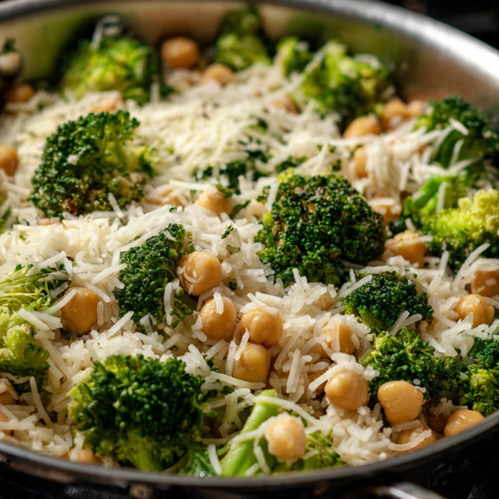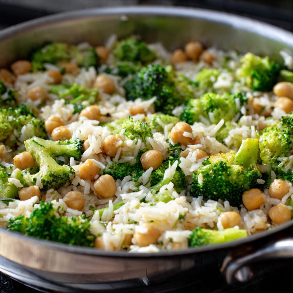 The smell of garlic, onion, and rice toasting together instantly feels comforting. Add broccoli and chickpeas simmering in creamy sauce, and you get a dish that nourishes without feeling heavy.
