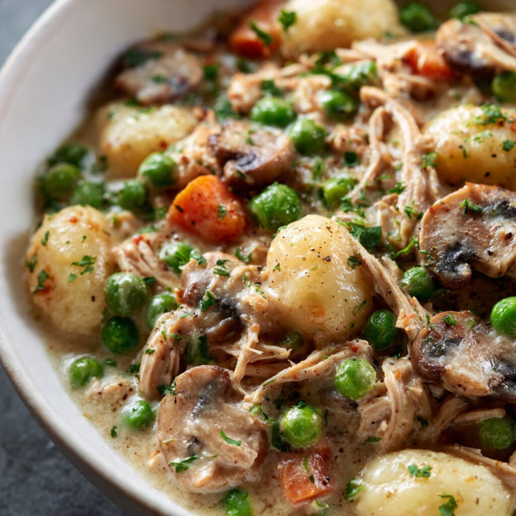 This recipe is a modern comfort-food mashup that borrows from two familiar classics: chicken pot pie and chicken and dumplings. Recent versions use gnocchi to replace the crust or dumplings, creating a dish that feels familiar but faster and easier to prepare.