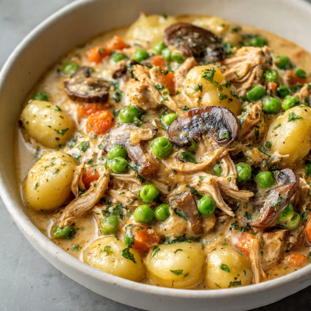 Creamy chicken pot pie filling with gnocchi, vegetables, and herbs.
