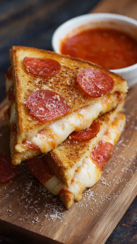 Pizza Grilled Cheese Sandwiches are the ultimate fusion of two beloved comfort foodsโcombining the gooey, cheesy goodness of a classic grilled cheese with all the flavors of pepperoni pizza. These sandwiches feature layers of melted mozzarella, crispy pepperoni, tangy pizza sauce, and Italian seasonings, all sandwiched between buttery, golden-brown toasted bread. It’s the perfect meal when you can’t decide between pizza night and comfort food, delivering the best of both worlds in every bite.