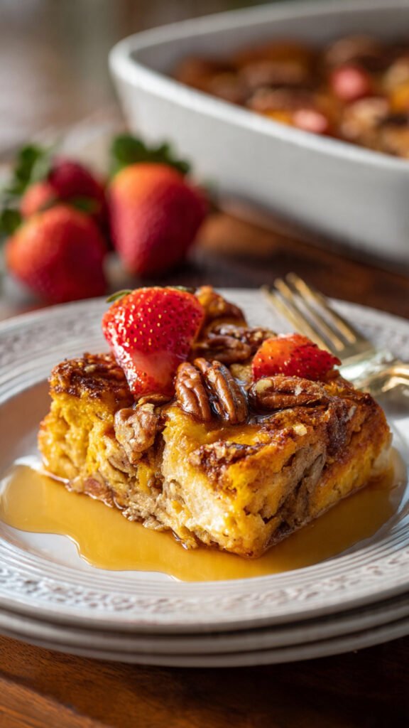 If you’re planning to serve this for a special breakfast or brunch, prepare everything the night before. Assemble the casserole and let it soak overnight, but wait to make the streusel until the morning. This ensures the topping stays crispy and fresh.