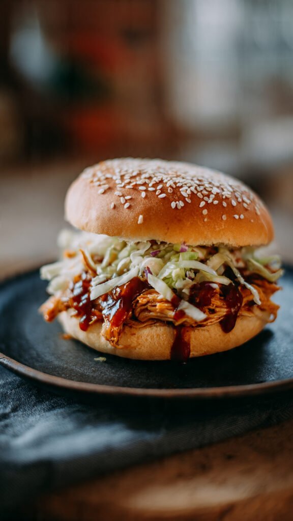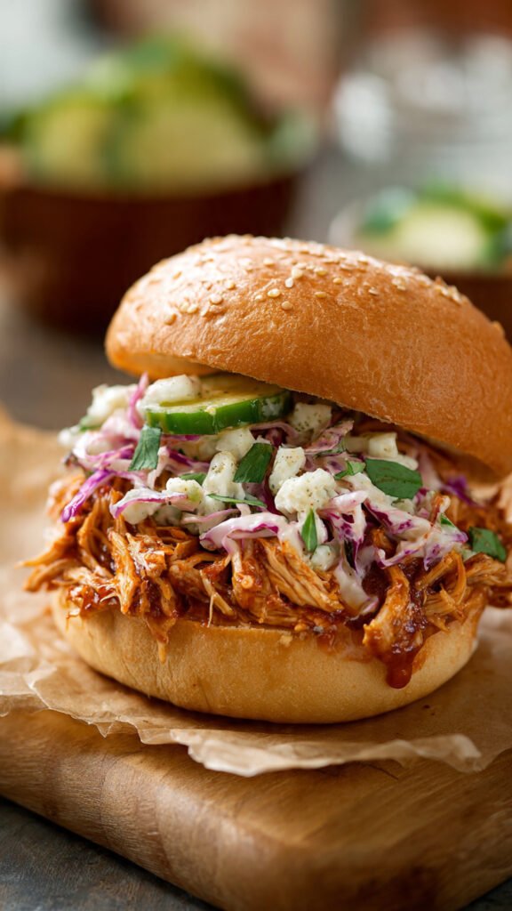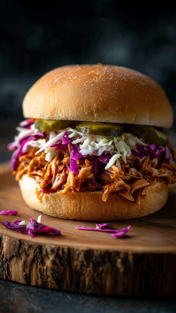 Pile the shredded BBQ chicken generously onto the toasted buns. For the ultimate sandwich experience, top with creamy homemade coleslaw. The cool, crunchy slaw provides a perfect contrast to the warm, tender chicken and adds a refreshing element that balances the richness of the barbecue sauce.