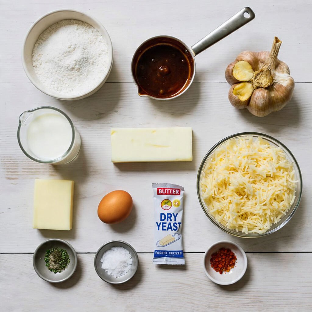 Flour, milk, yeast, egg, cream cheese, butter, roasted garlic, mozzarella, spices