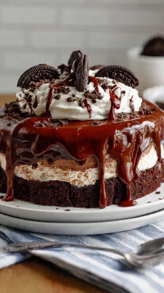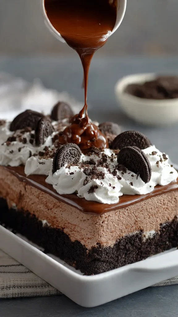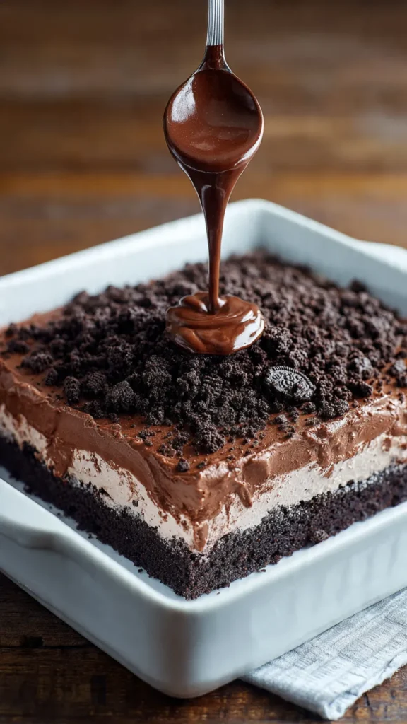 The genius of this dessert lies in its texture contrast. You get the soft, tender crumb of chocolate cake soaked with hot fudge, followed by smooth chocolate pudding, airy whipped topping studded with crunchy Oreo pieces, and a final sprinkling of cookie crumbs on top. Every forkful delivers multiple textures and intensities of chocolate flavor that keep you coming back for just one more bite.
