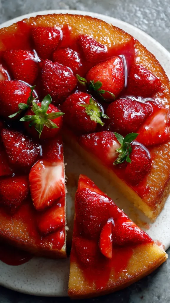 This Upside Down Strawberry Cake is the kind of dessert that looks impressive but feels wonderfully homey and nostalgic. Fresh strawberries bake into a glossy, buttery, caramel-like topping, while a soft, vanilla-scented cake rises underneath. Once you flip it, you get a beautiful ruby-red fruit layer sitting on a moist, tender crumb. Itโ€™s perfect for spring and summer gatherings, but honestly delicious any time you can find good strawberries.